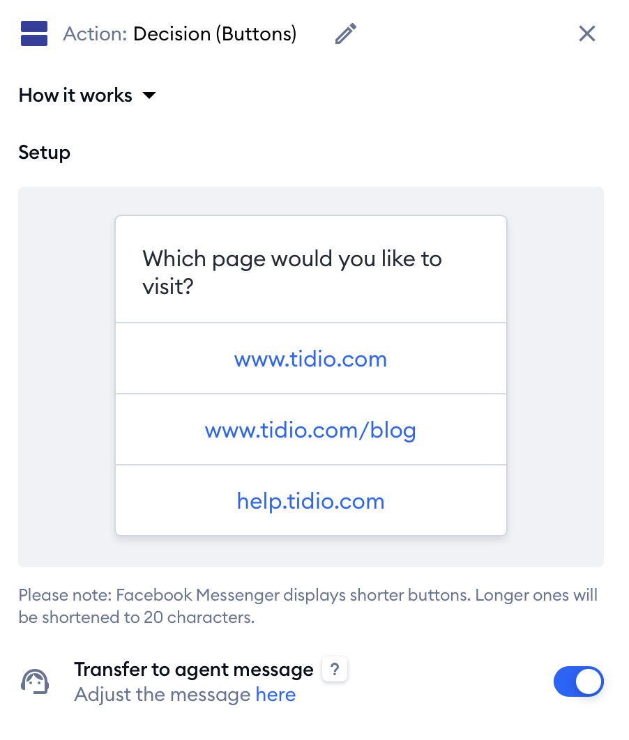 When the visitor answers the flow's question by typing instead of clicking on the flow's buttons - that effectively interrupts the flow. The Transfer to agent message will appear and the conversation will be transferred to your agents. This helps you ensure that no important conversations or questions are missed.