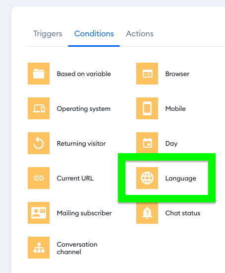 To allow your flow to detect the visitor's language preferences, you need to add the Language condition. You can find it in the Conditions menu on the right in the visual editor.