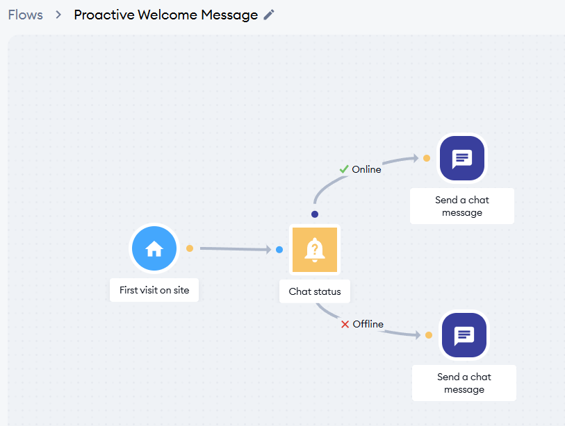 Tidio automatically activates a flow on your website during the initial setup. The flow is created with the First visit on site trigger, which displays an automated message immediately when a new visitor arrives on your site (here's a guide on modifying that message).