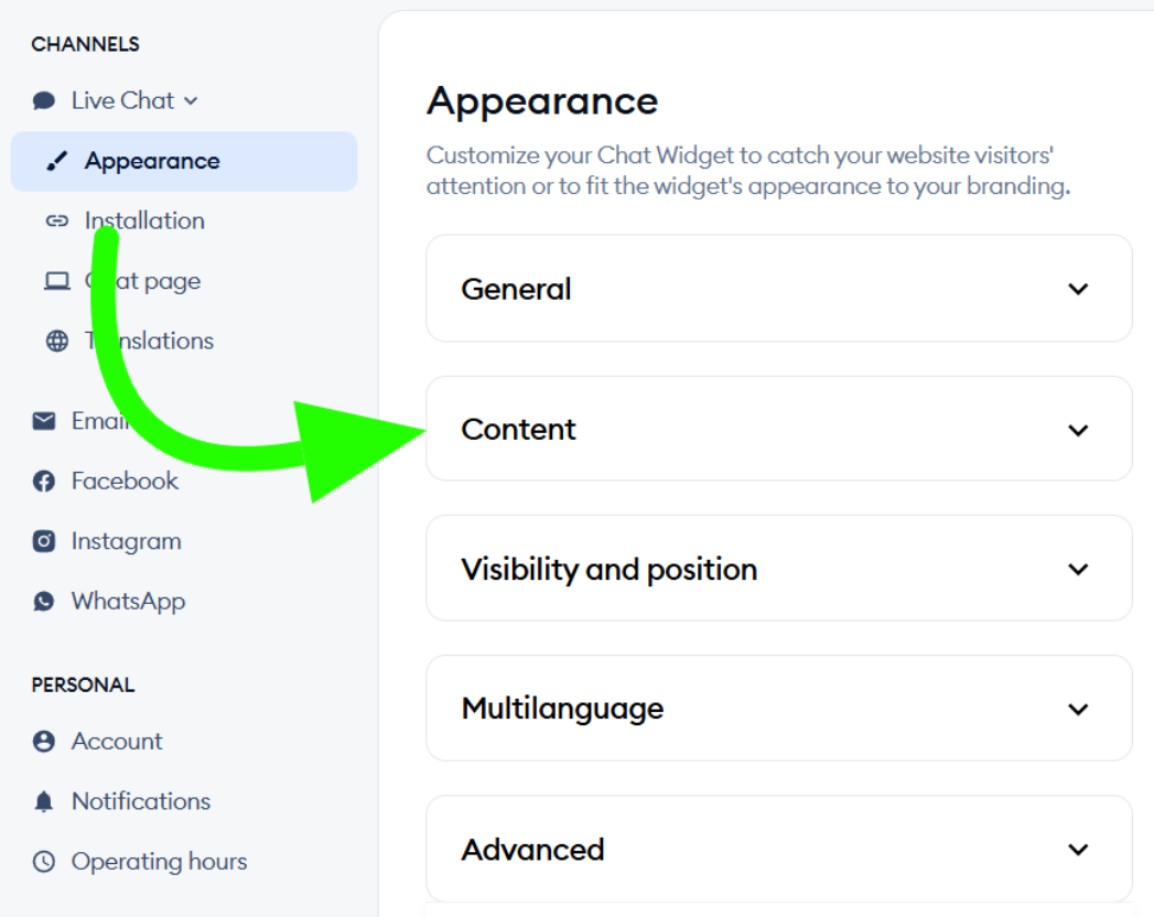 You can enable and modify it by accessing the Content section, found inside Settings > Live Chat > Appearance: