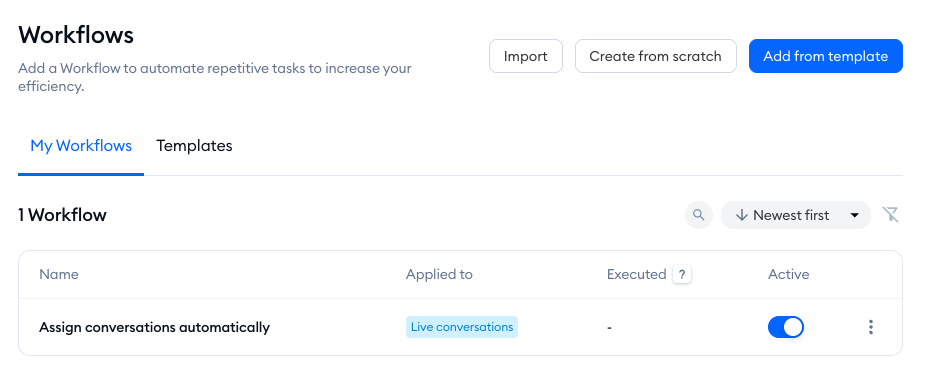 Once you've added your Assign conversations automatically workflow, it will be listed in the My Workflows tab: