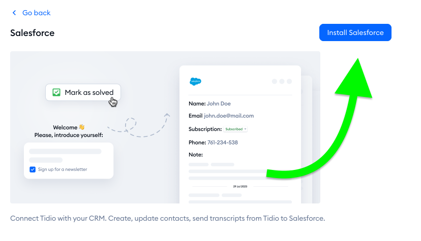 Tidio integration with Salesforce ensures that managing your contacts becomes effortless. Seamlessly create and update contacts in Salesforce directly from the Tidio panel, and effortlessly track and organize your Tidio conversations within the Salesforce dashboard.